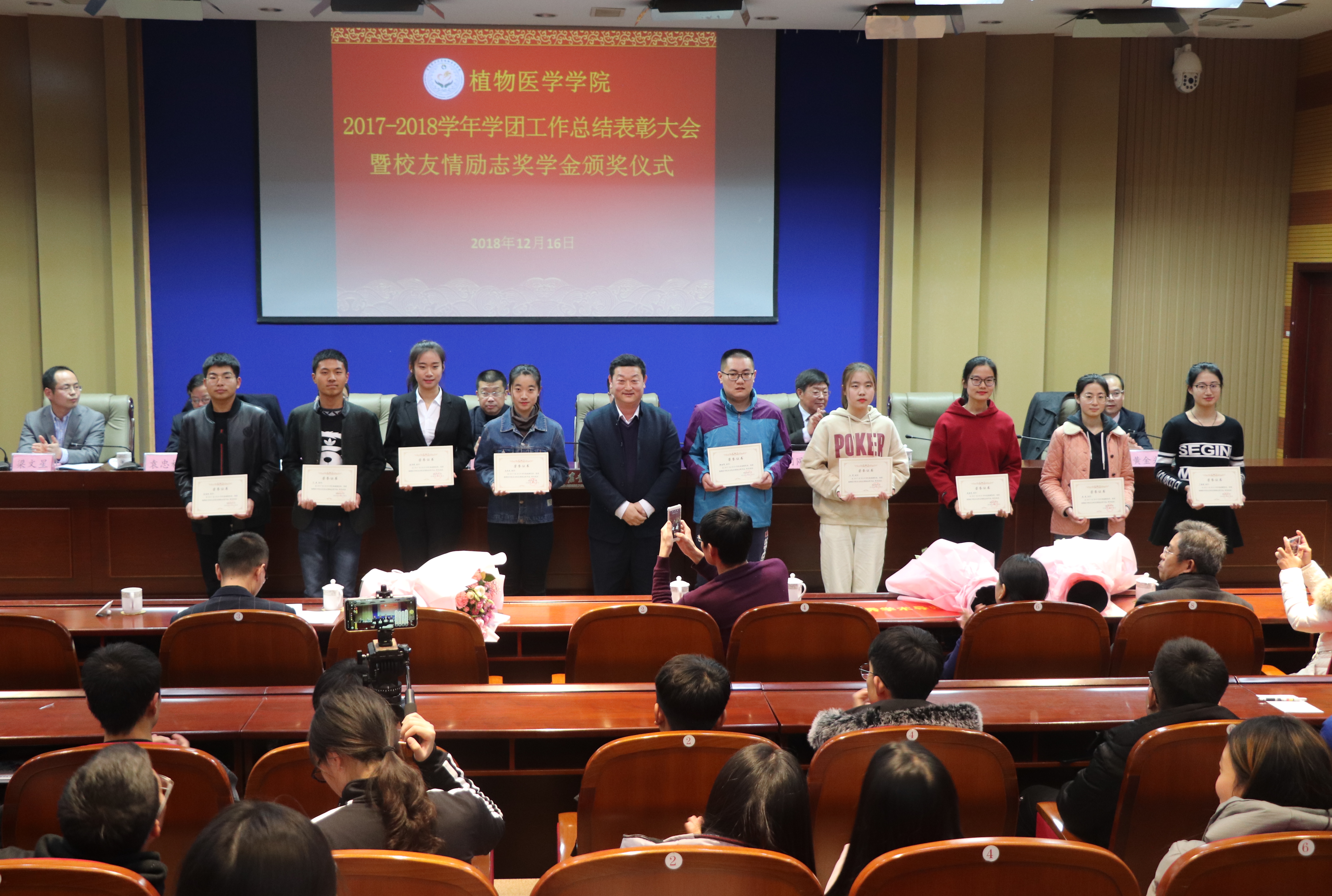 12月16日,青岛农业大学植物医学学院2017-2018学年学团工作总结表彰大会暨植物医学学院校友情励志奖学金颁奖仪式在学术会馆举行。校党委学生工作部(处)部(处)长王清春、校团委书记王峰、校党委研究生工作部(处)副部(处)长徐德武,植物医学校友会副会长、青岛谷成作物科技有限公司总经理赵红波和植物医学学院党政领导班子出席会议。会议由学院党总支副书记、副院长李军主持。