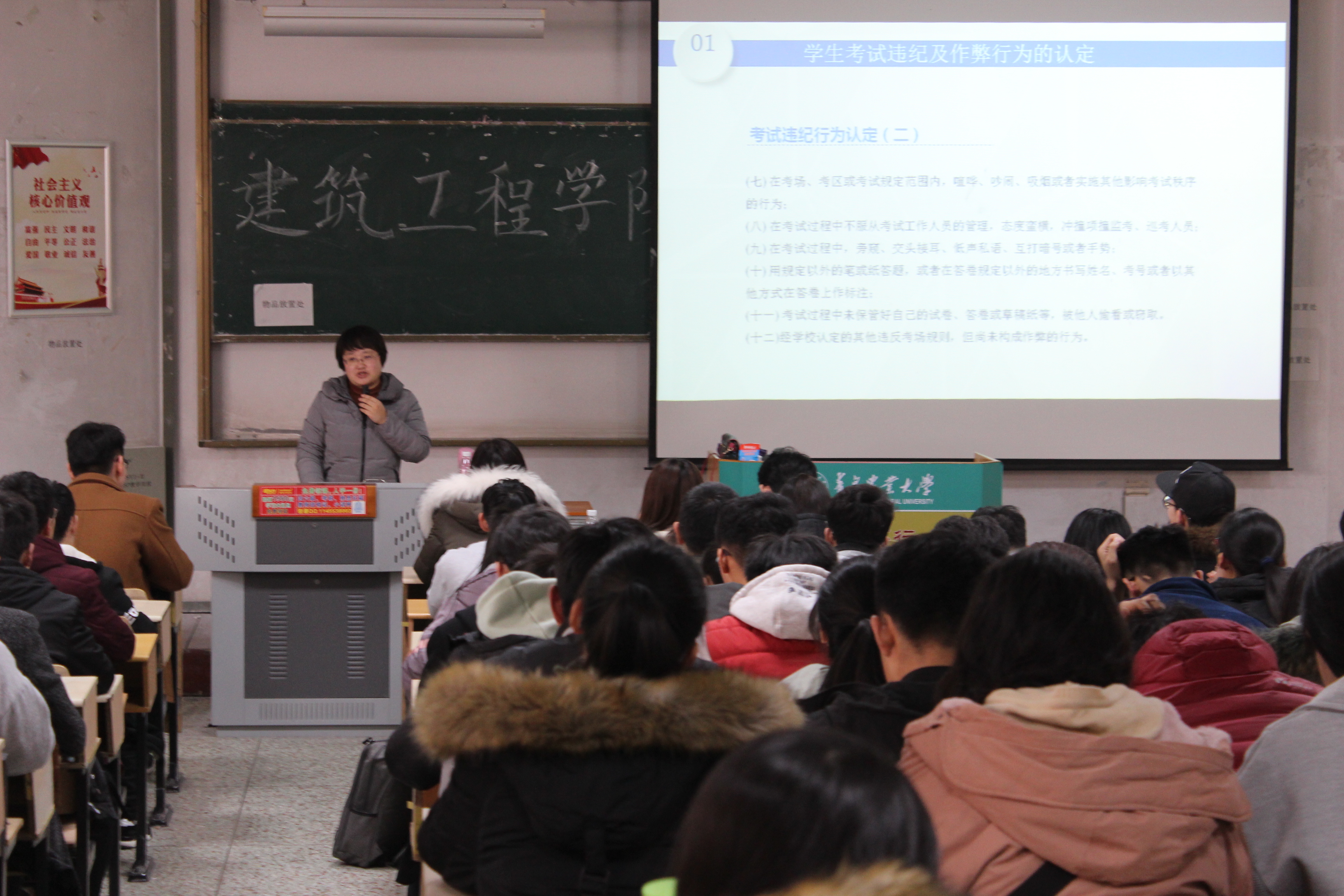 12月17日,青岛农业大学建筑工程学院于教学区D203举办期末考试考前动员大会,会议由学院辅导员林鑫主持,教学秘书刘文娟主讲,学院全体大一学生参加。