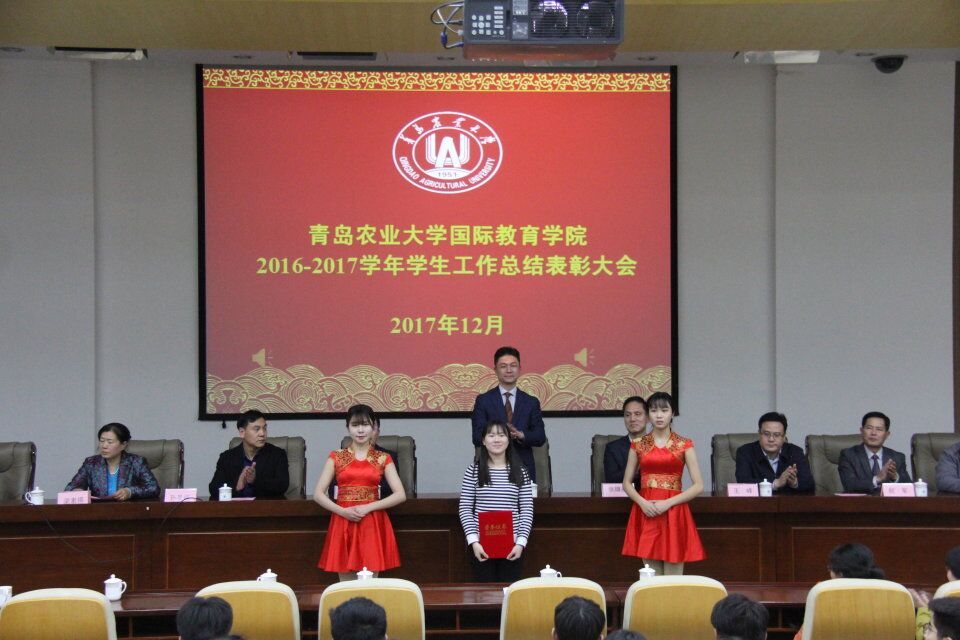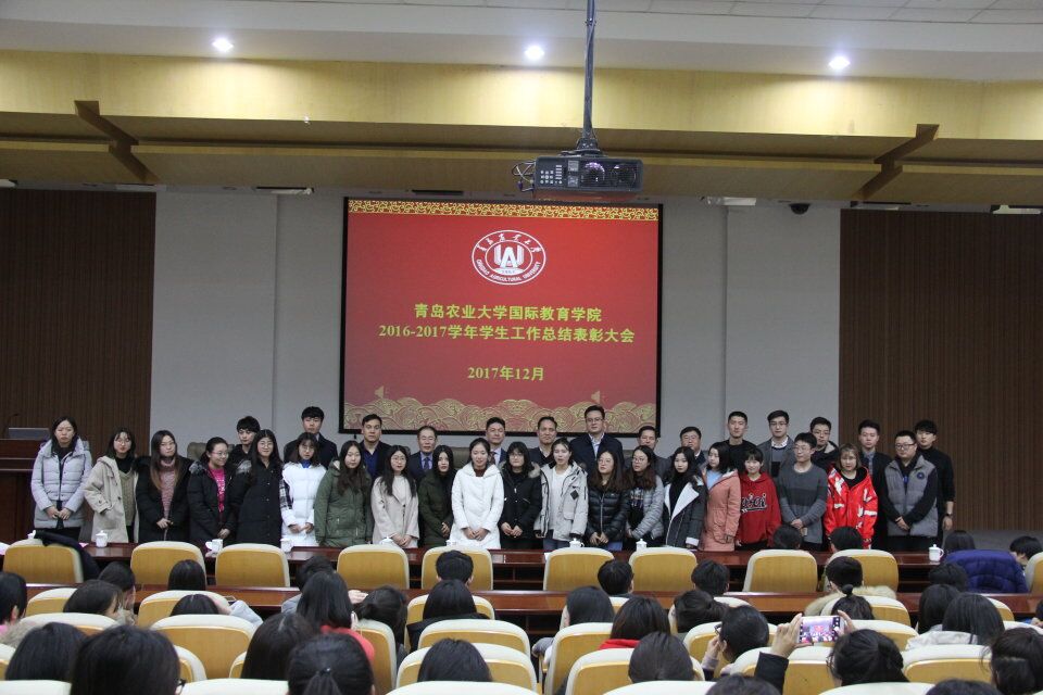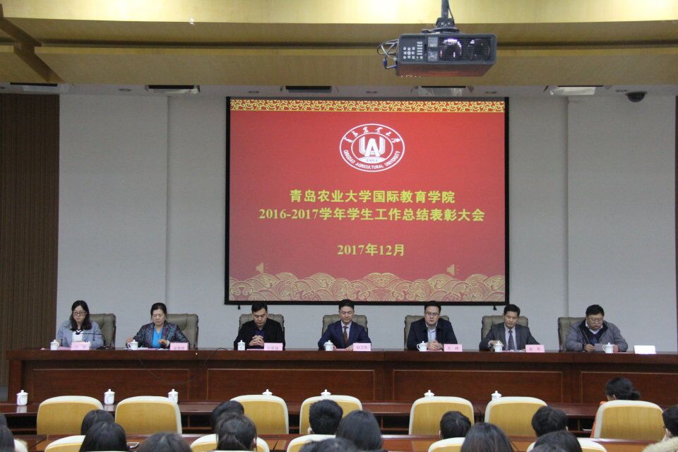 12月18日,国际教育学院于学术会馆第二报告厅隆重举行2016-2017学年学生工作总结表彰大会。青岛农业大学党委委员、副校长顾卫东,青岛农业大学-韩国昌原大学CEO班校友会会长张雄基、文济信出席,学工部(处)、校团委相关负责人、学院党政领导、班主任代表和全体学生参加。会议由学院党总支副书记、副院长王天龙主持。