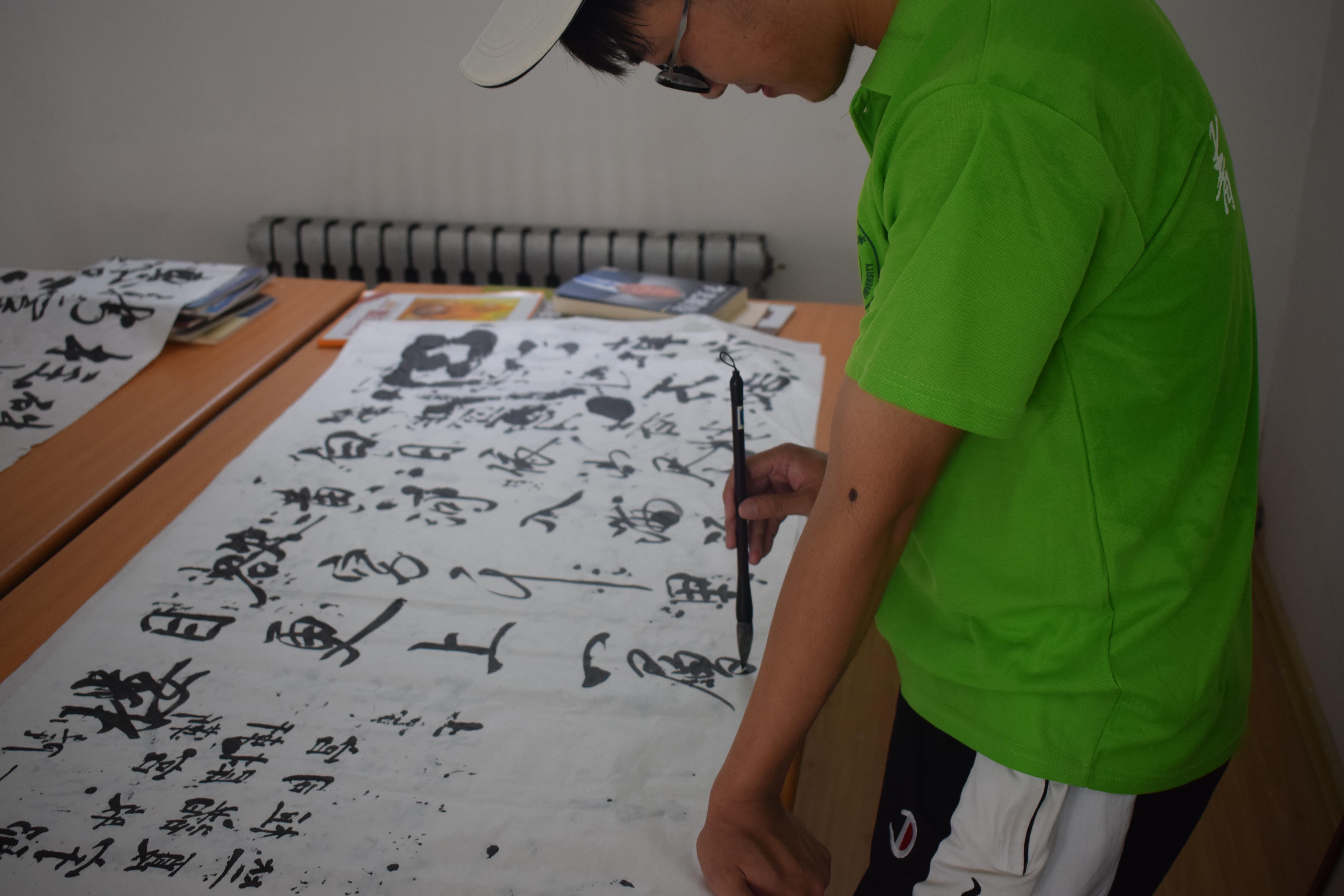 实践队员进入书法室,学习科室内展示的书法笔迹,情不自禁拿起笔书写起来。(魏庆洋摄)