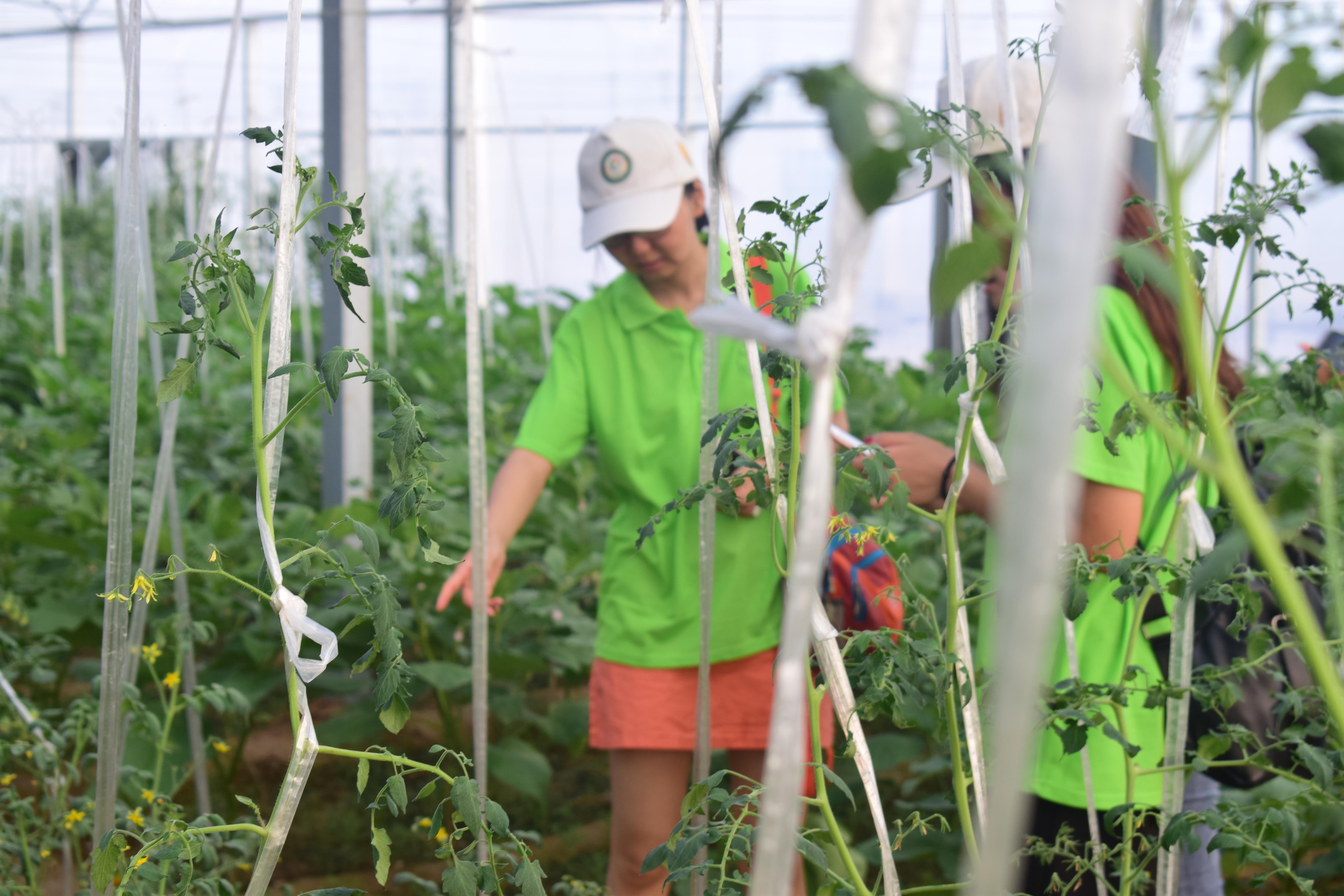 农学院教师孙筱璐与队员参观观光农业园。(魏庆洋摄)