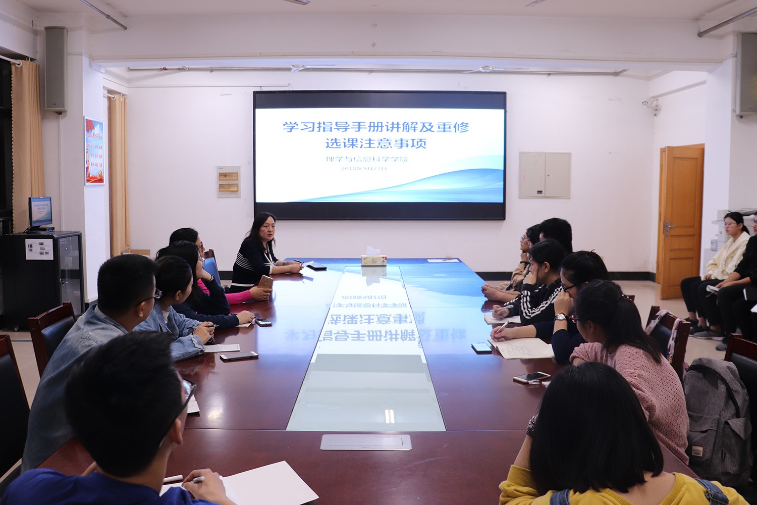 会议中,张艳从规章制度、学分制收费、学业审核、选课管理、学籍管理、学业管理六个方面细致地讲解了学生指导手册和重修选课注意事项,讲解了《2018-2019第一学期重修选课通知》和《关于网络通识课和网络教学平台的有关说明》两则文件。张艳指出:“选课是学分制教学管理的一个重要环节,也是出现问题比较多的环节,能否正确合理的选好课,关系到学生成绩的提交以及最终的毕业、授学位。”同时强调了同学要根据自身的实际情况选择选修课程,毕业生要及时查看自己的学业完成情况,并针对同学在学习生活中所遇到的常见问题作出了细致解答。