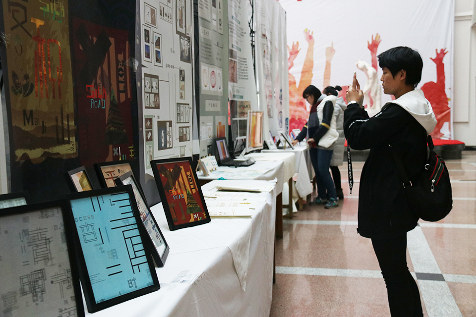 张佳璐的《思愁之路》将个人对家乡的思念与丝绸文化结合在一起作为设计灵感,大家能从作品中体味乡愁、感悟丝绸文化的魅力。由于航、孙资斌、沈战美慧共同合作创作的《影戏》系列手机主题图标更是吸引了大家的眼球。《皮影》以中国陕西皮影为主题,对皮影花纹、演出器具等一系列元素进行提取,与现代手机图标相结合,使中国的传统工艺美术成为具有中国特色和时代精神的艺术精粹走向世界。高本翔的《兵马俑也爱疯》将兵马俑结合当代时下文化奥特曼这一广受欢迎的形象做出造型,用复杂而美丽的花纹装饰面部,解决了当代人们认为兵马俑文化难接受、难欣赏的问题,带给大家全新的视觉体验,吸引了众多同学前来参观。