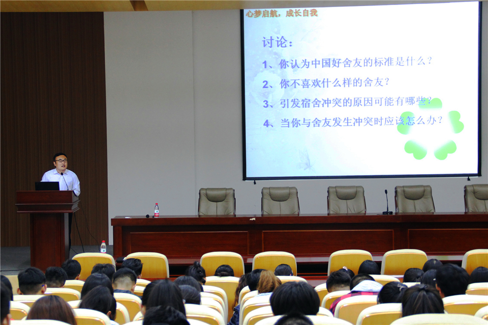 10月16日,在以“沟通的秘诀:大学生宿舍人际关系漫谈”为主题的讲座中,李永青以提问开篇,并结合多年学生管理工作经验与亲身经历,从宿舍矛盾产生的原因、解决矛盾的方式、人际交往的原则与模式、如何处理好个人与自己的关系等方面进行逐一讲解。讲座伊始,李永青向同学们抛出“你眼中的‘中国好舍友’是什么样的”“你最讨厌什么样的舍友”两个问题,让同学们明晰自己对舍友的喜恶。随后,他从同学们所普遍认同的观点讲起,以观点解析、案例分析、经验分享等多样方式,点面结合、深入浅出地就宿舍中的人际关系处理,为2018级新生们说明了如何正确处理宿舍人际关系、在人际交往中我们应如何做等。