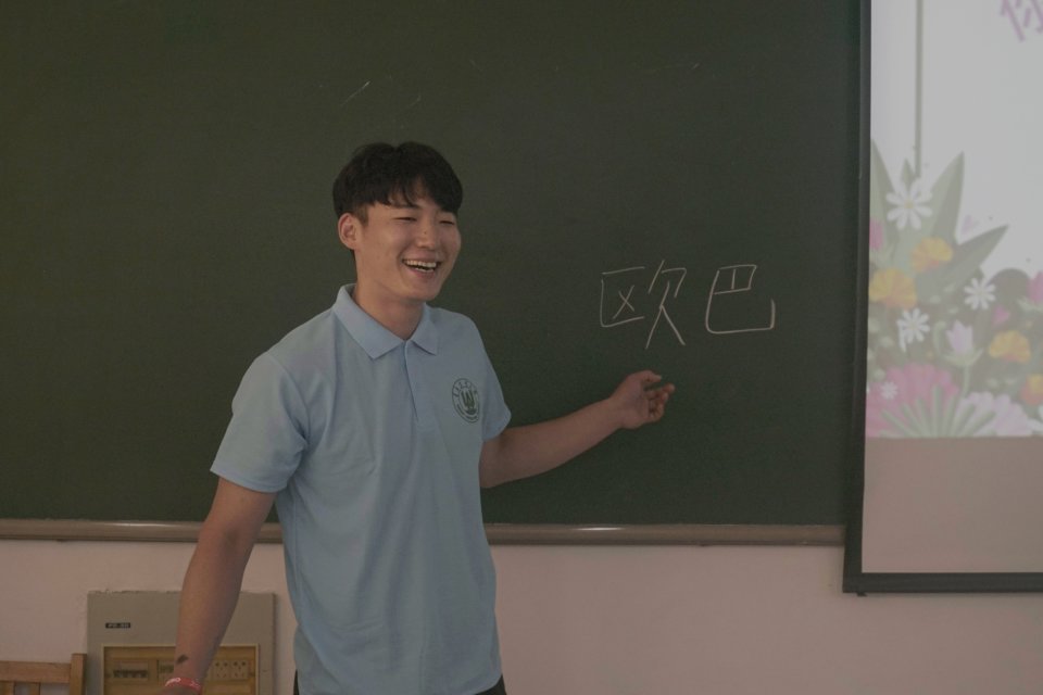 在正式上课之前,中外志愿者和小学员们依次走上讲台,在黑板上写下自己的名字,进行简单的自我介绍。其中留学生崔平和在黑板上写下“欧巴”两个字,让同学们立刻明白,原来这是一位来自韩国的小老师。这种介绍方式既拉近了彼此之间的距离,也展现了韩国的文化特色。