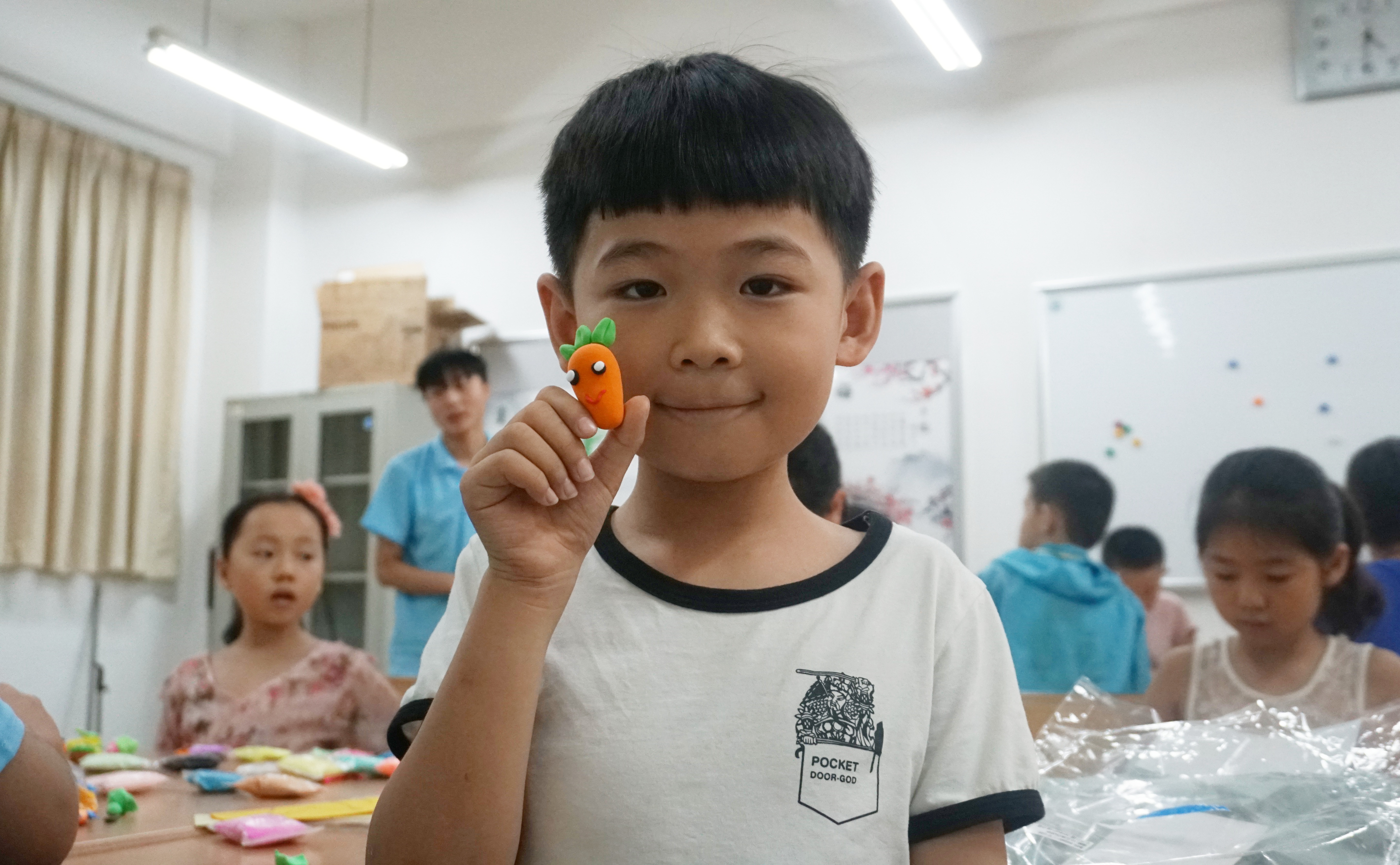 太空泥手工课是一堂别开生面的动手实践课。志愿者们将学员们分成三组,每组在拟定的三个主题“果蔬乐园”、“海底世界”、“甜品小屋”中进行抽签选择。孩子们聚精会神、团结互助,通过丰富的想象力和创造力,用自己一双双稚嫩的小手为太空泥赋予了生命灵动。最终每个小组在成果展示中将作品分享,并经民主投票选出最佳创作小组进行奖励。