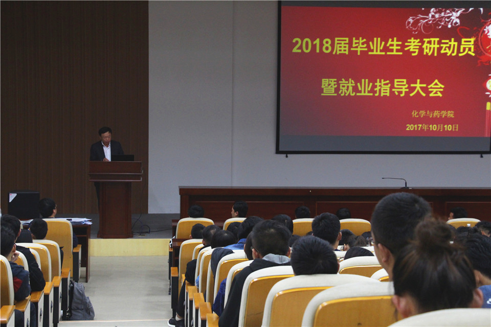 10月10日,青岛农业大学化学与药学院于学术会馆召开2018届毕业生考研动员·就业工作推进会。学院院长曲宝涵、院党委副书记史雪辉、副院长李峰正科级辅导员田保玲、杨冬冬等出席会议,会议由史雪辉主持,2018届全体应届毕业生参加。