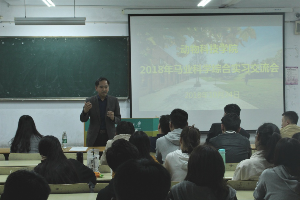 10月24日,动物科技学院召开2018年马业科学综合实习交流会。教务处副处长潘军,学校特聘教授、外籍教师凯瑟琳博士,学院党总支书记潘庆杰,学院党总支副书记、副院长展学斌,学院教学秘书王光,团委书记范楚琦,辅导员王保垒,专业教师于光辉、董瑞兰,马业科学实验室负责人赵珊珊,山东省马业协会曲梦出席会议,马科专业学子到场倾听。