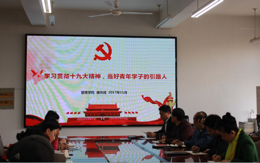 2017年11月9日,管理学院在院会议室召开“学习宣传贯彻十九大精神,当好青年学子的引路人”十九大精神及党章学习报告会,报告会由院党委书记唐传成主讲,全体教职工参加学习。