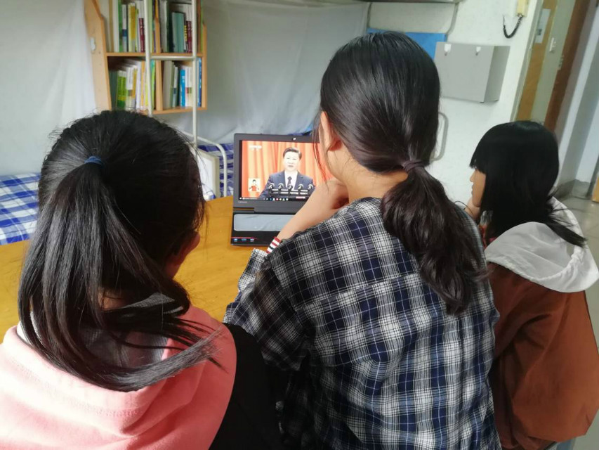 管理学院同学们在宿舍围坐在一起,观看十九大直播