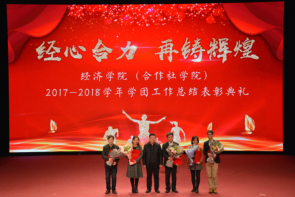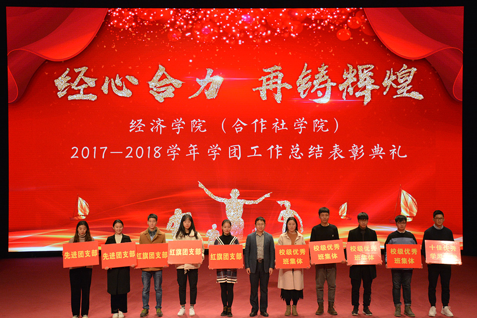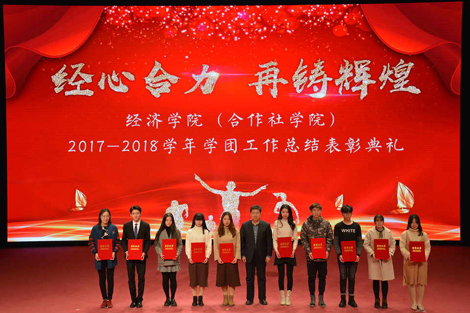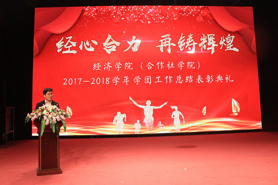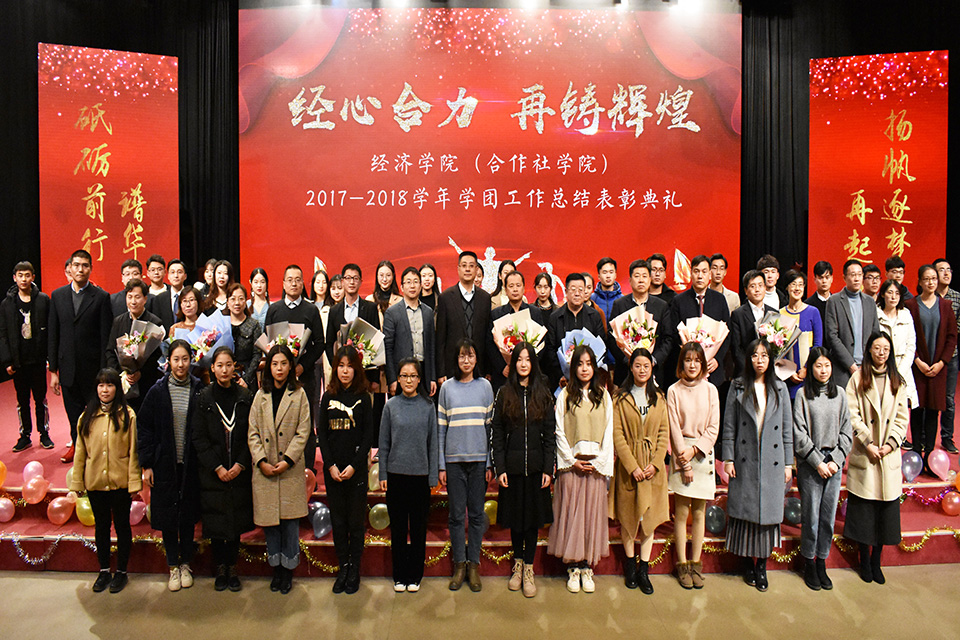 12月24日,青岛农业大学经济学院(合作社学院)在文经楼演播大厅举办“经心合力,再铸辉煌”2017—2018学年学团工作总结表彰大会。校党委委员、副校长牟少岩,校宣传部副部长孙广、校学工部副部长孙景福、校团委副书记王光炬,学院党政领导和学团干部出席表彰典礼。参加典礼的还有学院全体班主任和部分学生。