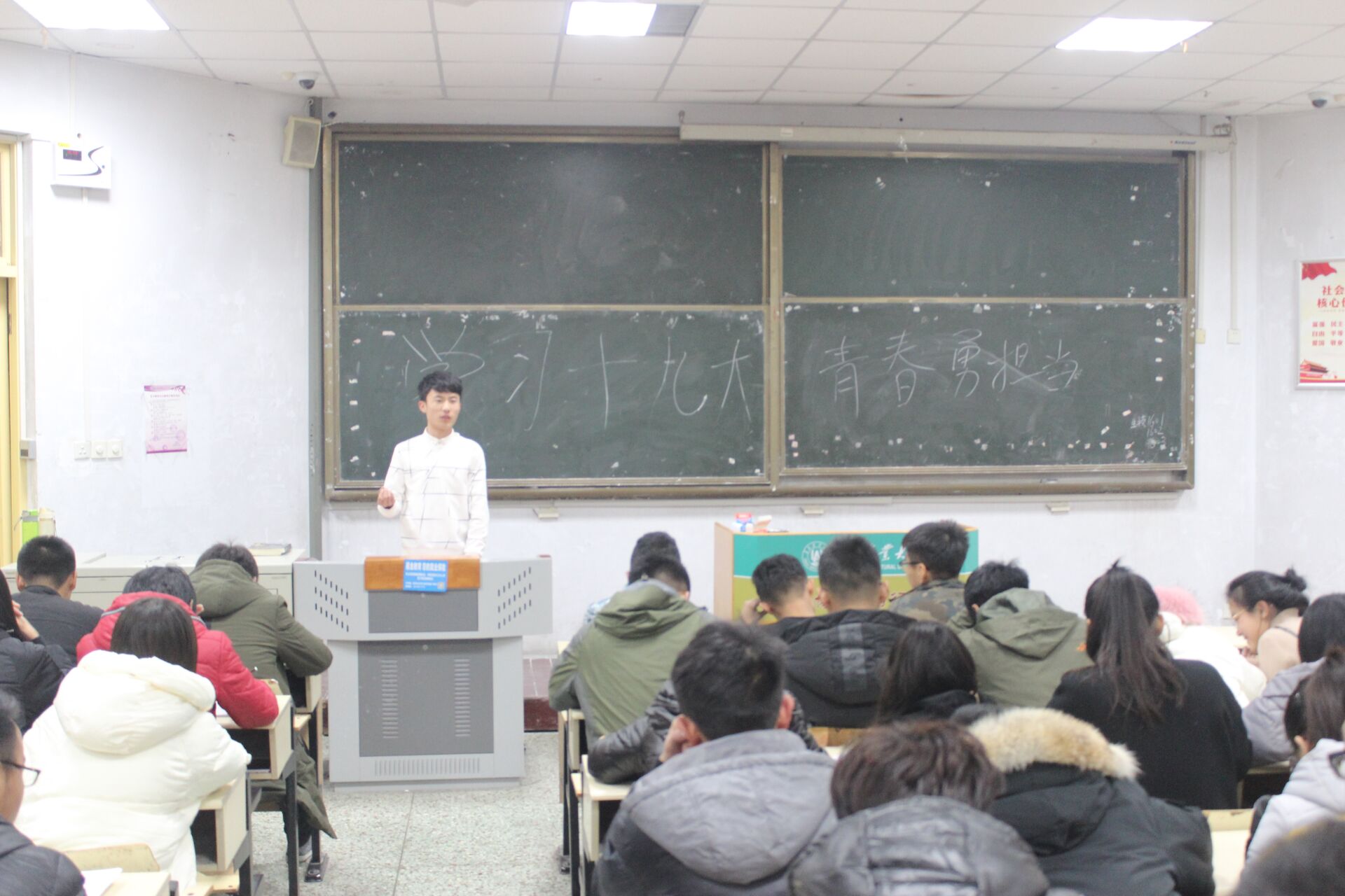11月19日,青岛农业大学生命科学学院在教学区开展了“学习十九大,青春勇担当”主题团课,全体同学参加。
