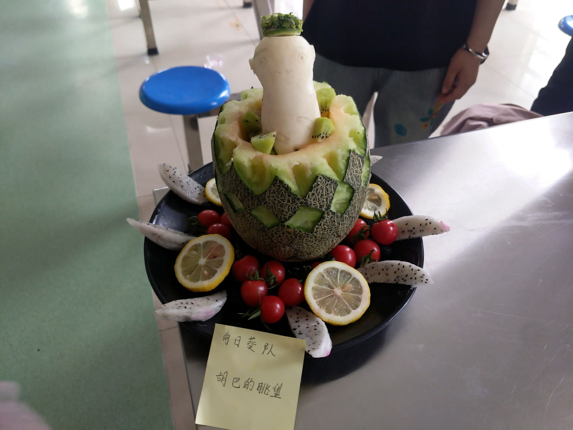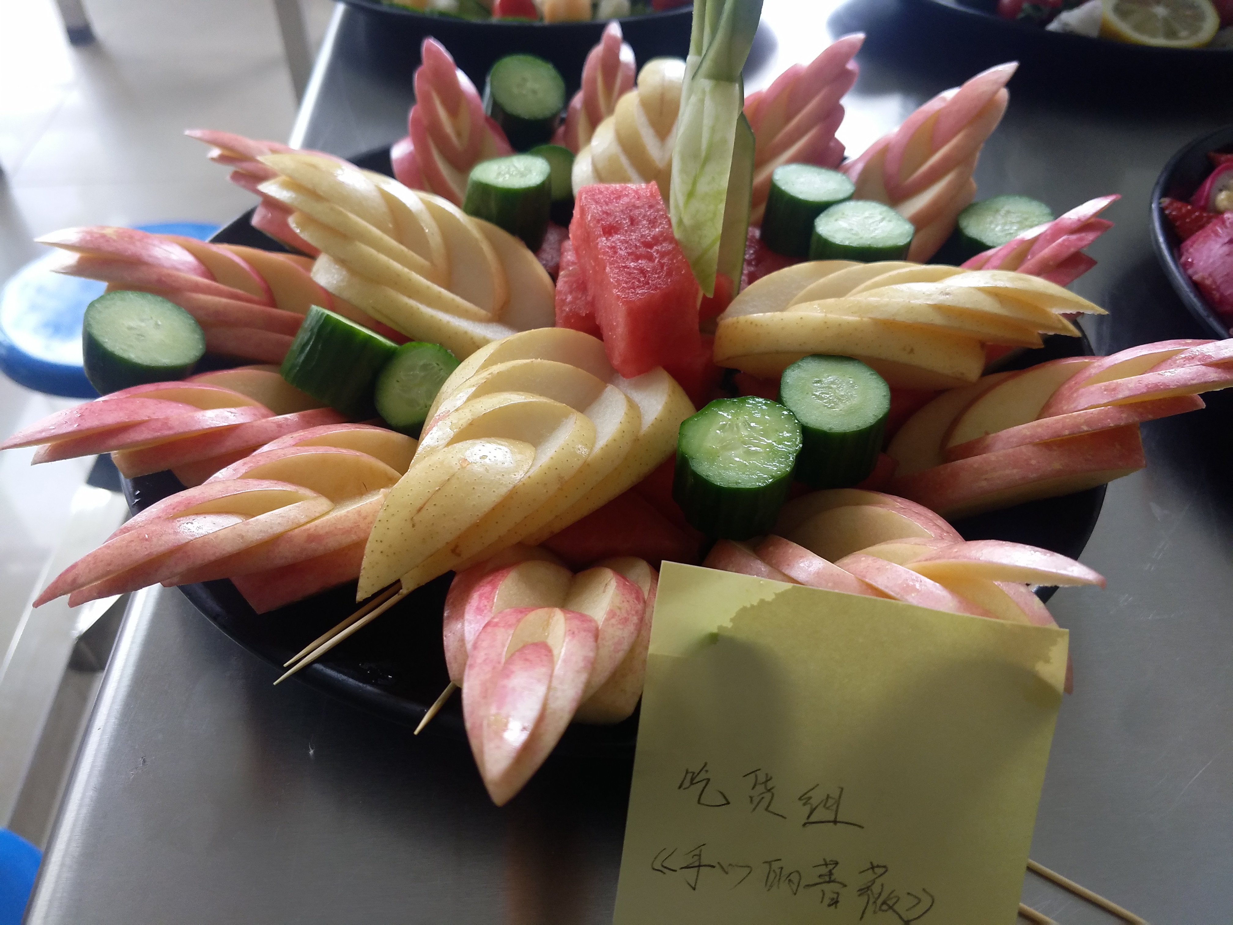 此次比赛分为两个环节——拼盘设计和拼盘介绍。拼盘设计以六部电影为主题,由赛前抽签决定,作品造型需与主题蕴意相贴合。在主持人宣布比赛开始之后,选手们纷纷灵活的运用手中的工具对水果进行雕刻摆拼,设计出一道道令人惊艳的作品。各代表队中最引人注目的当属抽中《手心的蔷薇》主题的“吃货队”了,虽然组员都是男生,却个个都是“能工巧匠”不仅将苹果雕刻出层次摆出了花的造型,还用普通的西瓜皮雕刻出了“凤凰”的形态。抽中《捉妖记》主题的“向日葵队”,则用萝卜雕刻出了可爱的“胡巴”。