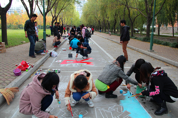 接下来,在教学区附近的毓秀南路上开展了本次社团文化节的第一个活动——“梦跃百年,青春有我”大地彩绘友谊交流赛,本次活动的作品面向全校征稿,是由入选作品的作者自行组织进行参与描绘的。活动中,同学们全身心地投入到大地彩绘的创作中去,他们用各色的颜料在大地上绘出斑斓夺目的图画,图画内容风格不一,有的婉转优美,有的色彩明快,有的风趣幽默,整个大地彩绘友谊交流赛现场一片忙碌的景象。在创作期间,校团委书记初磊亲自来到活动现场并参与到活动中,与同学们一起体验创作的乐趣,大家生动形象的作品赢得了领导老师们的一致好评。