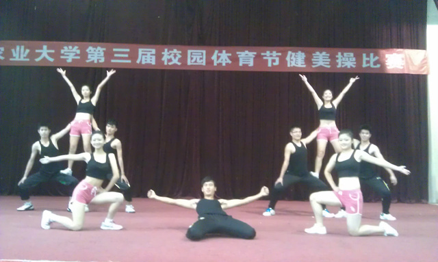 为了进一步推动学院校园文化建设,以和谐向上、活泼健康的校园文化氛围来迎接十八大的召开,;为给全校同学提供一个展现自我的舞台,更好的促进其全方面的发展,11月10日,我校第三届校园体育节健美操比赛文体馆成功举办。本次赛事由校体育教学部主办,以学院为单位、共18支队伍参加了比赛。