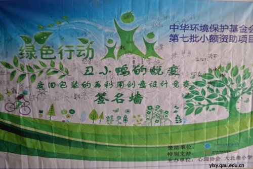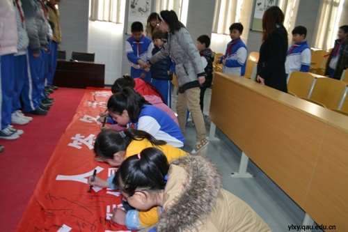 在活动结束之际,队员们分别组织有意向的小学生们在“环保校园我在行动”的宣言条幅和“丑小鸭的蜕变——废旧包装再利用创意设计竞赛”的报名墙上签下名字。看着孩子们认真的笔迹,队员们无不感动于一份份承诺的许下。