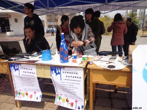 宣传活动从上午8点一直持续到下午4点,前来询问、绘瓶的同学络绎不绝。此次活动将于5月5日在文经楼前正式开展,届时会对现场彩绘的玻璃瓶进行优秀作品的展出与颁奖。此次以“变废为宝”为理念的彩绘玻璃瓶活动地开展,不仅丰富了同学们的课余生活,更为宣传环保节约理念、促进培养同学们的环保意识搭建了良好的平台。