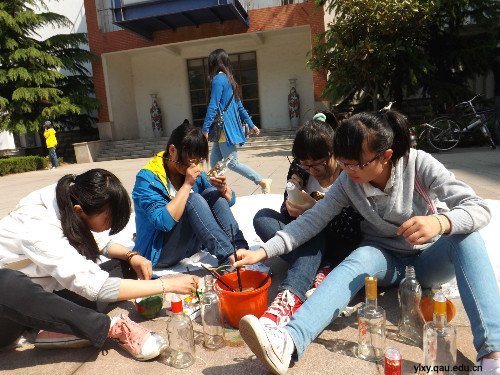 彩绘玻璃瓶,环保我行动。为积极传播环保理念,培养大学生环保意识,5月4日,园林与林学院于文经楼前举行大型彩绘玻璃瓶活动,彩绘玻璃瓶,即由协会提供玻璃瓶、颜料、画笔等工具,同学们自备彩绘图案、自选玻璃瓶并在瓶身自行彩绘。以其新颖的活动形式、创新的环保理念吸引了大量同学积极参加,赢得了同学们的广泛称赞。