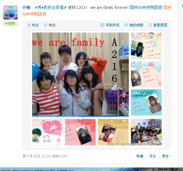 广秀全家福,温情传四海,目前,园林与林学院团委、心理发展部以及其他相关部门的积极引导下,活动得到全校师生的积极响应。主题或宿舍,或班级,或亲情,内容或搞怪,或感人,或温馨浪漫,精彩纷呈,各种丰富多彩,温情满溢的微博已在园林与林学院团委微博一一呈现。