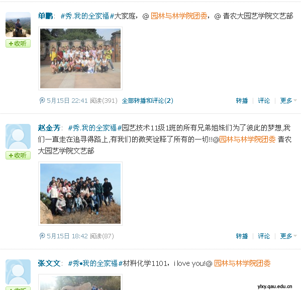 为提高大学生心理健康水平,结合大学生心理健康节“我的家·我的梦”的主题要求,营造和谐的校园文化氛围,5月18日,园林与林学院特举办“秀·我的全家福”线上温情传递活动,旨在利用便捷的微博平台、简单的语言以及同学们“全家福”主题图片引导大学生发现、传递、珍惜身边的友情、亲情、爱情,教育大学生珍惜生命、珍爱生活,感恩父母、感恩师长、感恩社会。