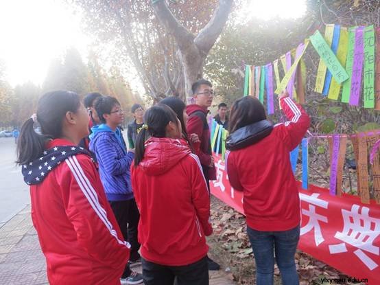 此次活动围绕猜花谜的形式展开,大量与花有关的谜语及题目被写在五彩的卡纸上,悬挂于道路旁,吸引着来往的学生驻足猜题。有以诗词为谜面的猜花名的字谜,也有如答各市市花的问答题题目,在增强活动趣味性的同时,也增加了同学们的花卉知识。而身着统一红色服装的活动组织者一边为同学们介绍活动内容,一边为猜对谜语的同学们分发着鲜花等纪念礼品,活动现场一时间火爆非凡。