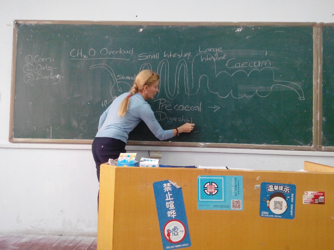 凯瑟琳博士拥有25年的马饲养和马营养科研经验,研究方向主要为马匹营养学、动物医学、营养添加剂的生产制造、马房建设等,曾多次带领新西兰马业专家来中国考察,在美国、新西兰、中国都做过马匹营养学相关科研项目。本次授课除吸引了动科院马科学生外,本校非马科专业学生、甚至外地的师生也都慕名前来旁听。