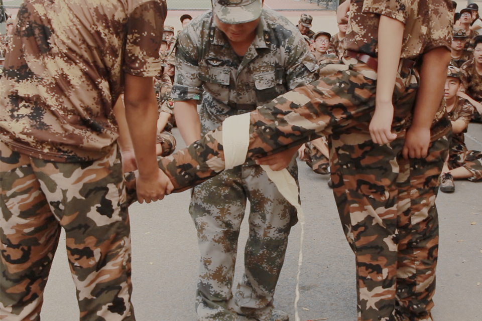 教官亲身示范并讲解包扎急救措施